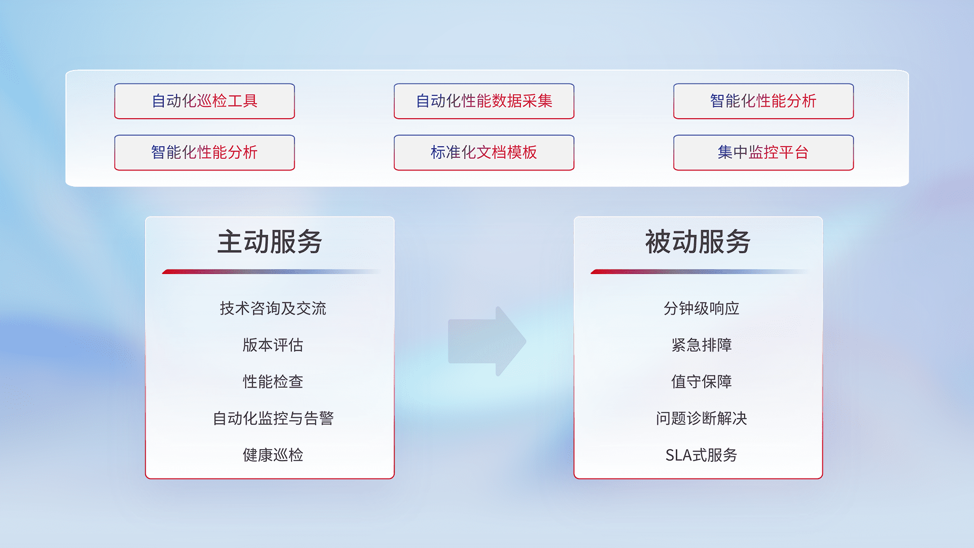 智能化工具和标准化文档,,,保障服务质量,,,,提供主动服务(包含技术咨询、、、版本评估、、、、性能检查、、自动化监控与告警、、健康巡检)和被动服务包含(分钟级响应、、紧急排障、、、、值守保障、、问题诊断解决、、、、SLA服务)。。